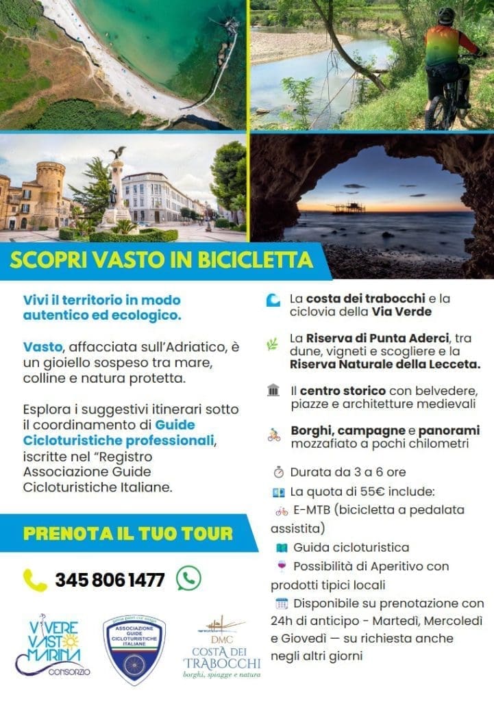 De Costa dei Trabocchi fietstochten zijn beschikbaar op reservering 24 uur van tevoren (dinsdag, woensdag en donderdag, of andere dagen op aanvraag), geschikt voor degenen die het gebied willen ervaren op een authentieke en ecologische manier, met een betaalbare prijs (van 55€ tot 65€) die fiets, gids en de magie van een ervaring om mee naar huis te nemen omvat.