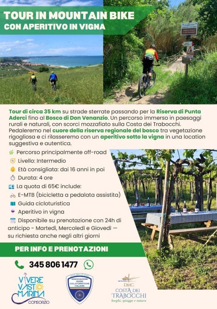 Als je op zoek bent naar een intensere ervaring, kun je deelnemen aan de mountainbiketocht met aperitief in de wijngaard: 35 km onverharde paden door het Punta Aderci Reservaat naar het Don Venanzio Bos, waarbij je door het hart van een regionaal reservaat te midden van weelderige vegetatie trapt. Hier wacht je een aperitief onder een wijngaard, op een authentieke locatie, waar de smaak van wijn samenkomt met de geur van gras en het gezang van krekels.